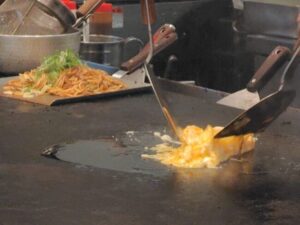 かなりソースがはねるので、テーブルマットでソースが自分にかからないようにします。