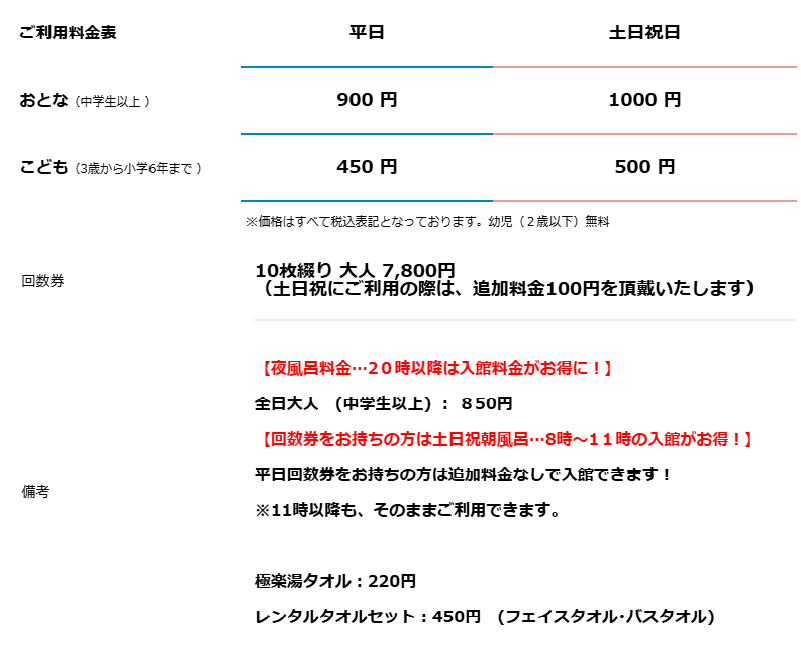 極楽湯 羽生温泉は平日と土日祝日、入館時間によって入館料金が変わります。