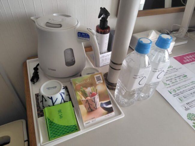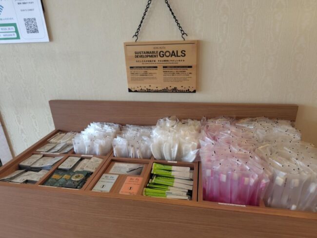 歯ブラシや化粧水などのアメニティはフロント前にありますので、必要な分を自分でとって部屋に持ち込みましょう。