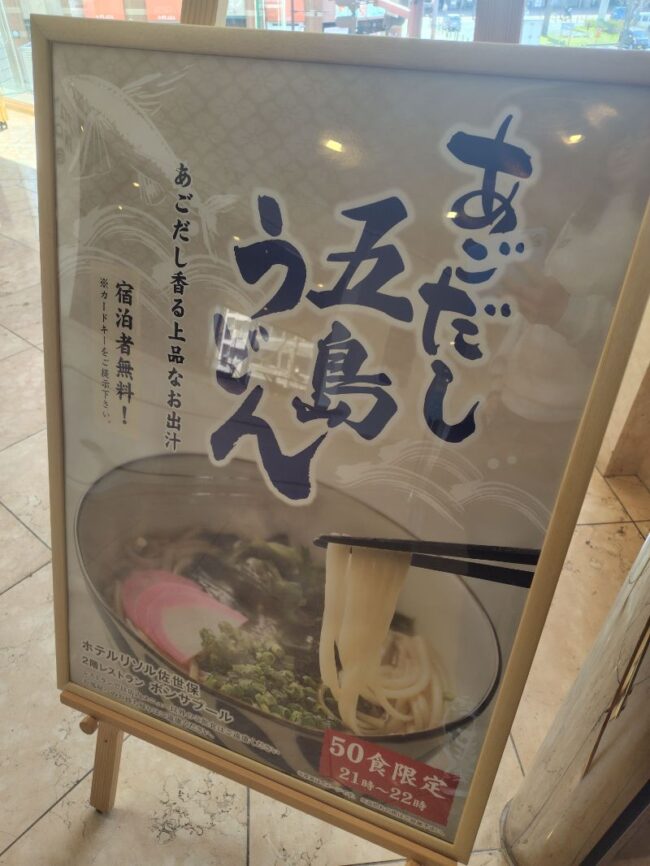 21時~22時の間、ホテル宿泊者は無料であごだし五島うどんを食べられます。