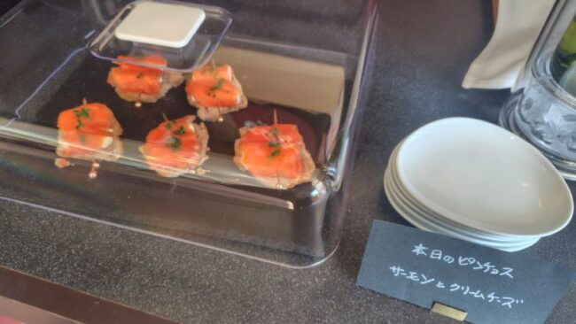 アルコールからソフトドリンク、スモークサーモンの一口サンドイッチ等、かなり充実!