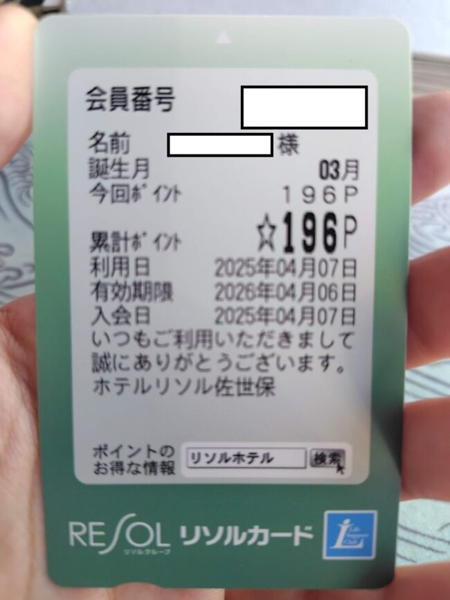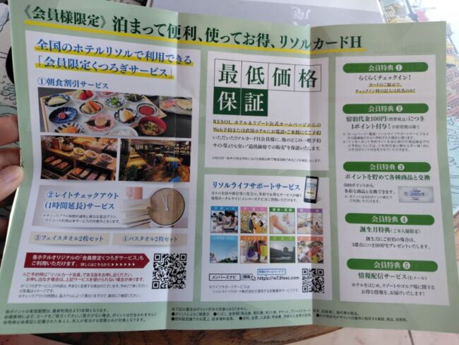 チェックアウト時にリソルの会員カードを受け取れるので忘れずに受け取りましょう。