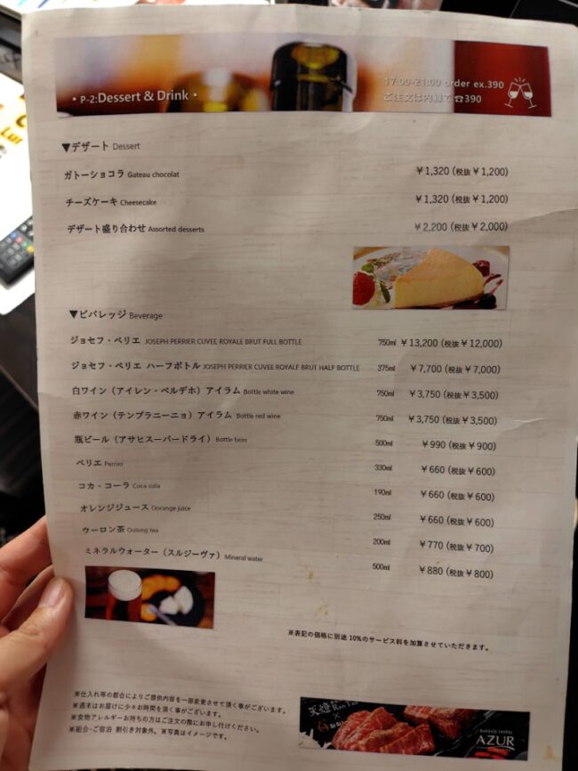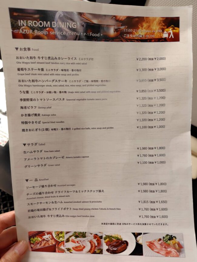 ルームサービスメニューも部屋にあったので見ましたが、大分和牛や焼きそば、デザートまでいろいろな種類がありました。