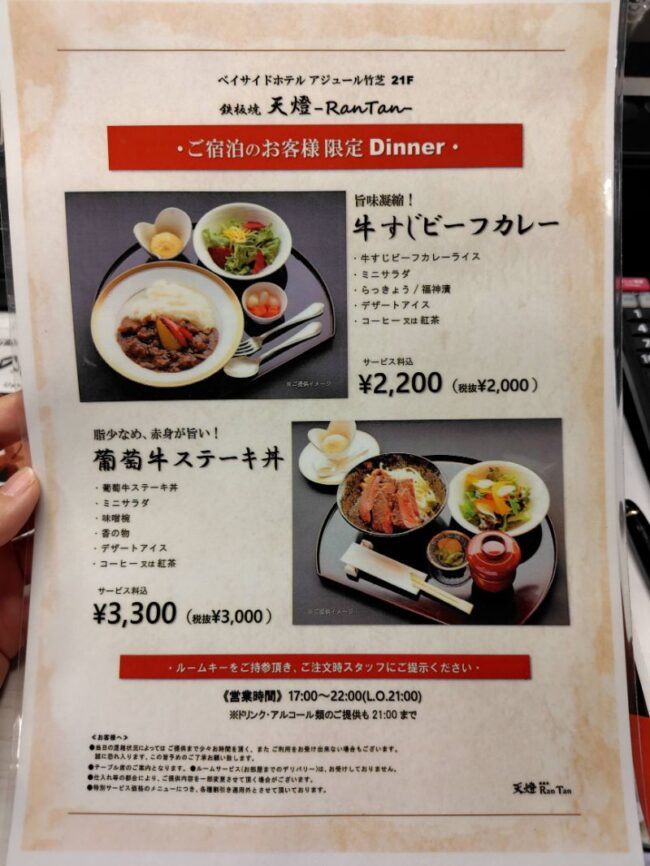 宿泊者限定ディナーは、お店にルームキーの提示が必要です。