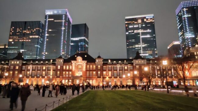 東京駅舎、夜のライトアップがきれいなので丸の内イルミネーションと一緒に見にいきました。