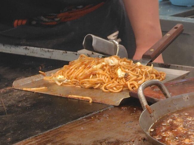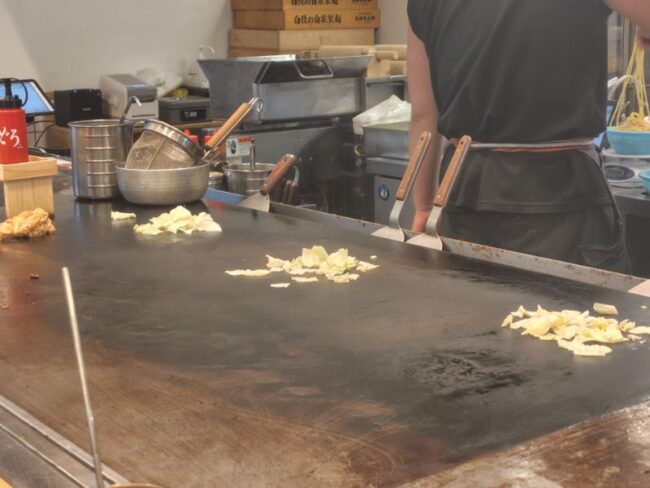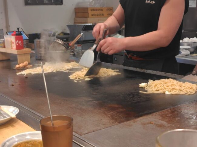 注文してから焼きそばの具材と麺をお店の方が鉄板で焼き始めました。