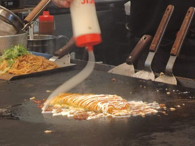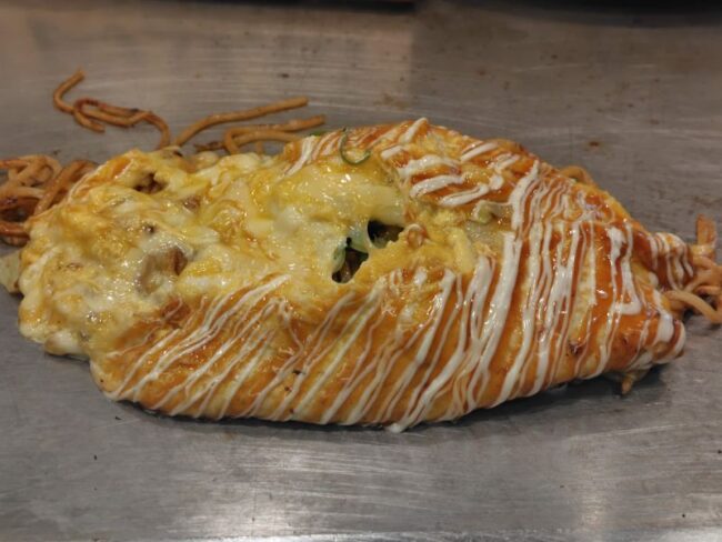 ソースとマヨネーズをかけてもらって、チーズオムソバ到着。
