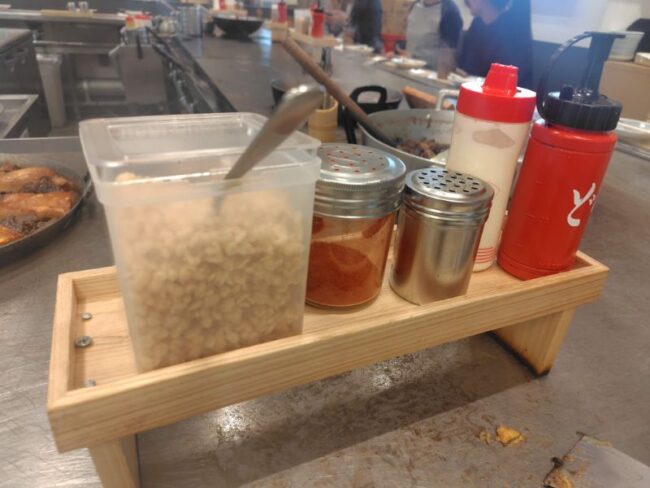 また、揚げ玉や追加のマヨネーズやソースは席の近くに置いてあるので自由に使えます。